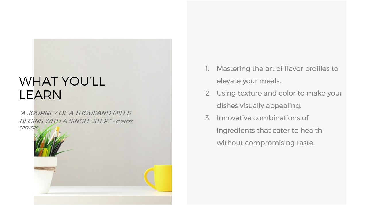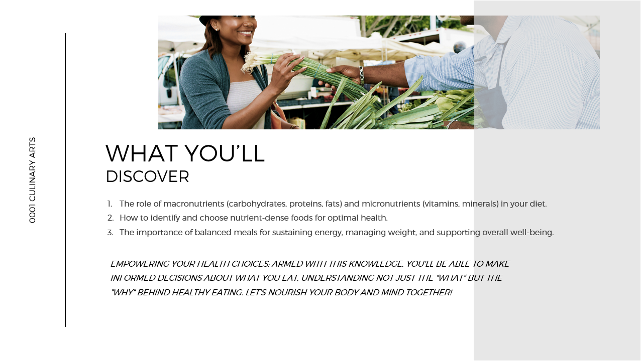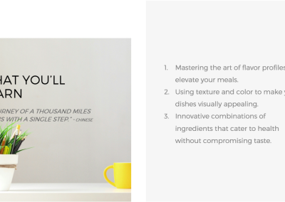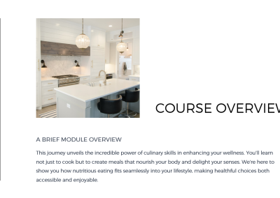 “I used to feel overwhelmed in the kitchen, but this course has completely transformed my approach to cooking. The hands-on lessons and personalized tips have given me the confidence to prepare nutritious meals for my family every day.”EXAMPLE